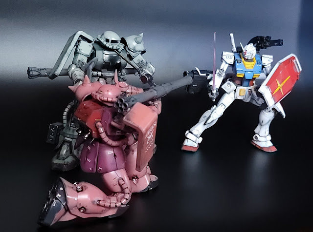 Battle shots - I was all done shooting and had posed the two Zakus for display in my Ikea Detolf case, but I had to take a few more photos of the duo in action against Amuro's Gundam! Tricky to fit all three in my narrow photo area, but still fun.
